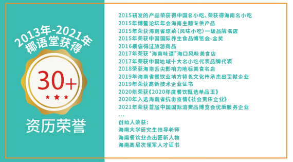 椰語(yǔ)堂公司介紹 椰語(yǔ)堂始創(chuàng)于2012年,是海南一家把海南清補(bǔ)涼為代表的特色小吃精致化、標(biāo)準(zhǔn)化并進(jìn)行連鎖發(fā)展的企業(yè),椰語(yǔ)堂專(zhuān)注于海南本土地域特色元素特別是椰子系列產(chǎn)品的深度研發(fā)。椰語(yǔ)堂被評(píng)為海南風(fēng)味小吃一級(jí)品牌名店,椰語(yǔ)堂多款小吃被評(píng)為海南名小吃、中國(guó)名小吃,并被選為中國(guó)地域十大名小吃代表品牌。椰語(yǔ)堂的全國(guó)門(mén)店分布在各高端商場(chǎng)、機(jī)場(chǎng)、郵輪、五星級(jí)酒店、動(dòng)車(chē)站、景區(qū)等。椰語(yǔ)堂清補(bǔ)涼被選為博鰲亞洲論壇專(zhuān)供產(chǎn)品、中國(guó)國(guó)際養(yǎng)生食品博覽會(huì)金獎(jiǎng)等殊榮,椰語(yǔ)堂清補(bǔ)涼在線下各連鎖賣(mài)場(chǎng)、盒馬鮮生、中石化易捷、中石油昆侖、全國(guó)30多家機(jī)場(chǎng)、五星、七星酒店等渠道銷(xiāo)售并成為政府及集團(tuán)采購(gòu)產(chǎn)品。在電商線上渠道,椰語(yǔ)堂椰奶清補(bǔ)涼無(wú)論在銷(xiāo)量和好評(píng)方面是品類(lèi)第一,是深受消費(fèi)者喜愛(ài)的高品質(zhì)產(chǎn)品。椰語(yǔ)堂是海南大學(xué)食品學(xué)院研究生實(shí)習(xí)基地,公司發(fā)揮椰語(yǔ)堂研究院優(yōu)勢(shì),擁有產(chǎn)品研發(fā)方面的多項(xiàng)專(zhuān)利。椰語(yǔ)堂因?yàn)槠鋬?yōu)秀品質(zhì)及良好顧客體驗(yàn),被中央電視臺(tái)、湖南衛(wèi)視、旅游衛(wèi)視等多家衛(wèi)視、人民日?qǐng)?bào)、中國(guó)縣域經(jīng)濟(jì)報(bào)、新浪、騰訊、SSBD等國(guó)內(nèi)外媒體報(bào)道宣揚(yáng)。椰語(yǔ)堂是海南文化的傳播和弘揚(yáng)者,是海南地標(biāo)美食品牌的優(yōu)秀代表和海南地域文化的一張亮麗名片,同時(shí),椰語(yǔ)堂也是中國(guó)連鎖經(jīng)營(yíng)協(xié)會(huì)會(huì)員單位。 more |